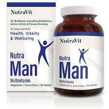 Nutra Man мултивитаминските таблети претставуваат комплетна формулација за поддршка на машкото здравје, виталност и благосостојба. Содржат 34 хранливи материи, вклучувајќи ги сите есенцијални витамини и минерали со додадени пробиотици, аминокиселини и панакс женшен.