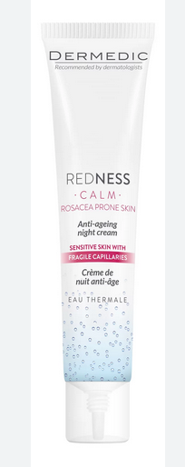 Ноќната крема против стареење Dermedic Redness Calm ќе ви помогне да постигнете посакувани резултати додека ја штитите кожата погодена од црвенило. Овој производ се препорачува за употреба во раните фази на розацеа и во случаи на хиперсензитивност. Формулата е збогатена со комплекс од витамини и минерали кои го обновуваат епидермисот, го забавуваат процесот на стареење и ја обезбедуваат цврстината на кожата. Ноќната антисениорска крема за нега на хиперактивна кожа погодена од купероза, како и во раните фази на розацеа, нуди видливи ефекти уште од првите недели на редовна употреба.